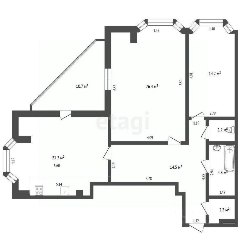 Характеристики квартиры: площадь 86 кв.м. — это достаточно для комфортного проживания, особенно если вы ищете что-то уютное. Квартира имеет функциональную планировку: большая кухня-гостиная 21,2 м2, спальня 14,2 м2, гостиная 26,4 м2.