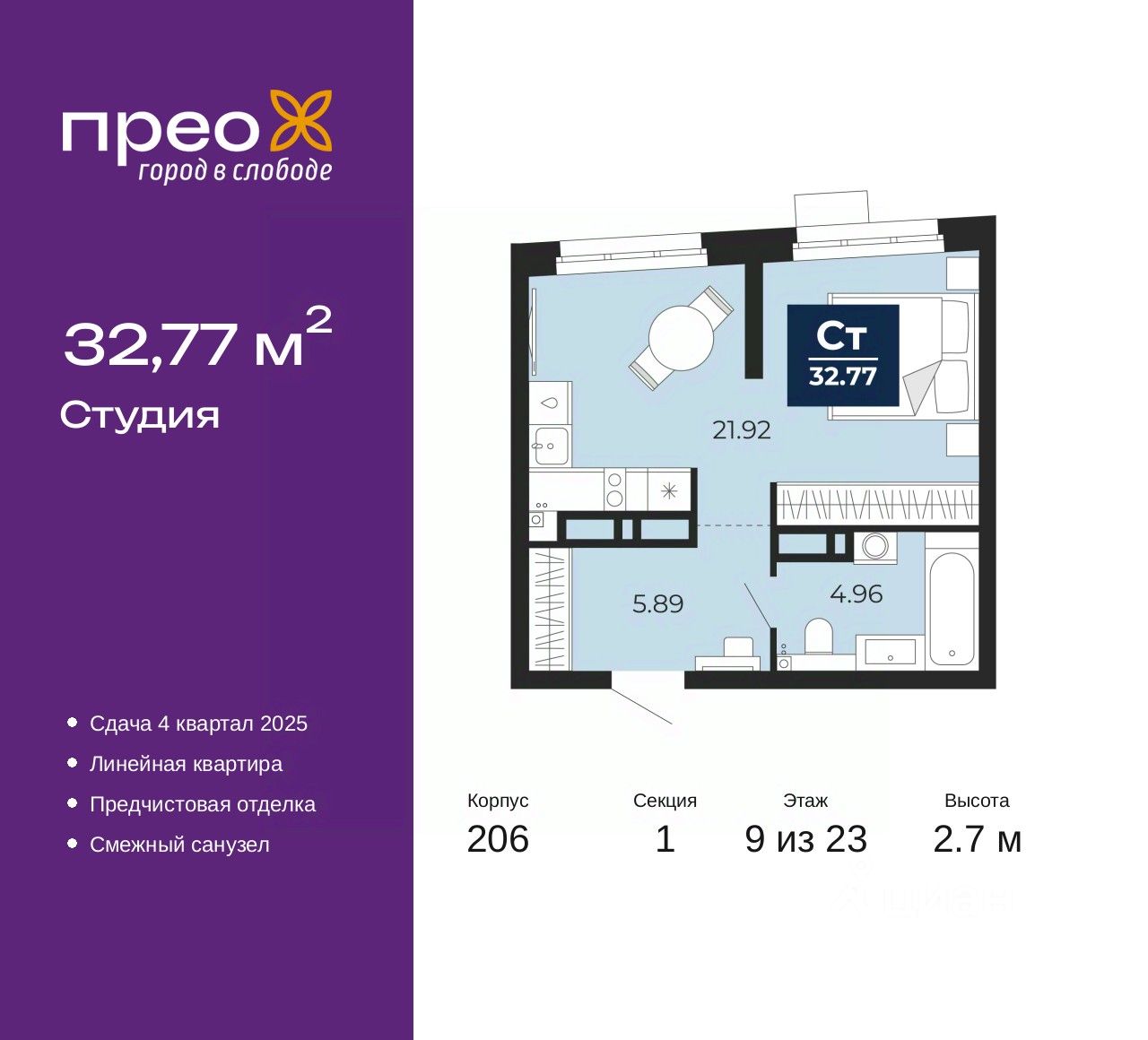 Продается 1-комн. квартира-студия с предчистовой отделкой в ЖК "Прео" на 9 этаже. Общая площадь: 32.77 кв.м., площадь гостиной 21.92 кв.м., из которых 10 кв.м. выделено под кухонную зону. Все окна выходят на одну сторону. В квартире один совмещенный санузел. Высота потолков 2.7 м.