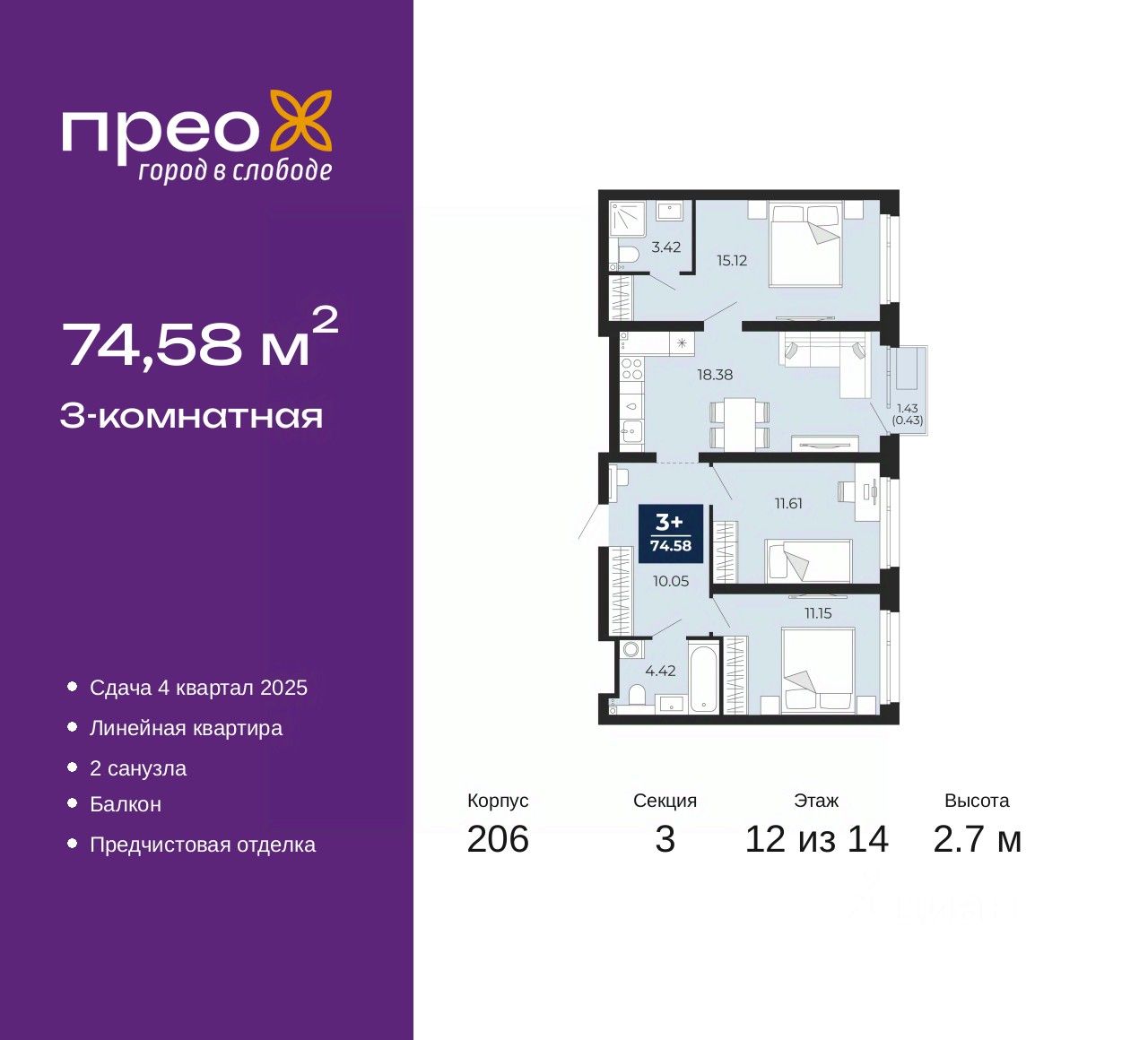 Трехкомнатная квартира от застройщика с предчистовой отделкой в ЖК "Прео" на 12 этаже. Общая площадь: 74.58 кв.м., жилая: 37.88 кв.м., площадь просторной кухни-столовой: 18.38 кв.м. Комнаты изолированные, все окна выходят на одну сторону. В квартире один балкон, два совмещенных санузла. Высота потолков 2.7 м.