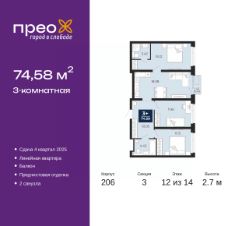 3-комн. квартира от застройщика с предчистовой отделкой в ЖК "Прео" на 12 этаже. Общая площадь: 74.58 кв.м., жилая: 37.88 кв.м., площадь просторной кухни-столовой: 18.38 кв.м. Комнаты изолированные, все окна выходят на одну сторону. В квартире один балкон, два совмещенных санузла. Высота потолков 2.7 м.