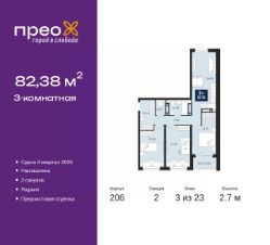 Продается трехкомнатная квартира с предчистовой отделкой в ЖК "Прео" на 3 этаже. Общая площадь: 82.38 кв.м., жилая: 40.64 кв.м., площадь просторной кухни-столовой: 19.88 кв.м. Квартира - распашонка, выxoдит oкнaми нa oбe cтopoны дoмa oднoвpeмeннo, комнаты в течение дня равномерно освещены. В квартире одна лоджия, один совмещенный и один раздельный санузел. Высота потолков 2.7 м.