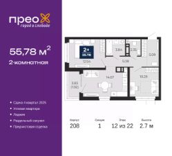 Продается двухкомнатная квартира от застройщика с предчистовой отделкой в ЖК "Прео" на 12 этаже. Общая площадь: 55.78 кв.м., жилая: 22.83 кв.м., площадь просторной кухни-столовой: 14.67 кв.м. Квартира угловая, идеально подойдет любителям тишины и панорамных видов. В квартире одна лоджия, один раздельный санузел. Высота потолков 2.7 м.