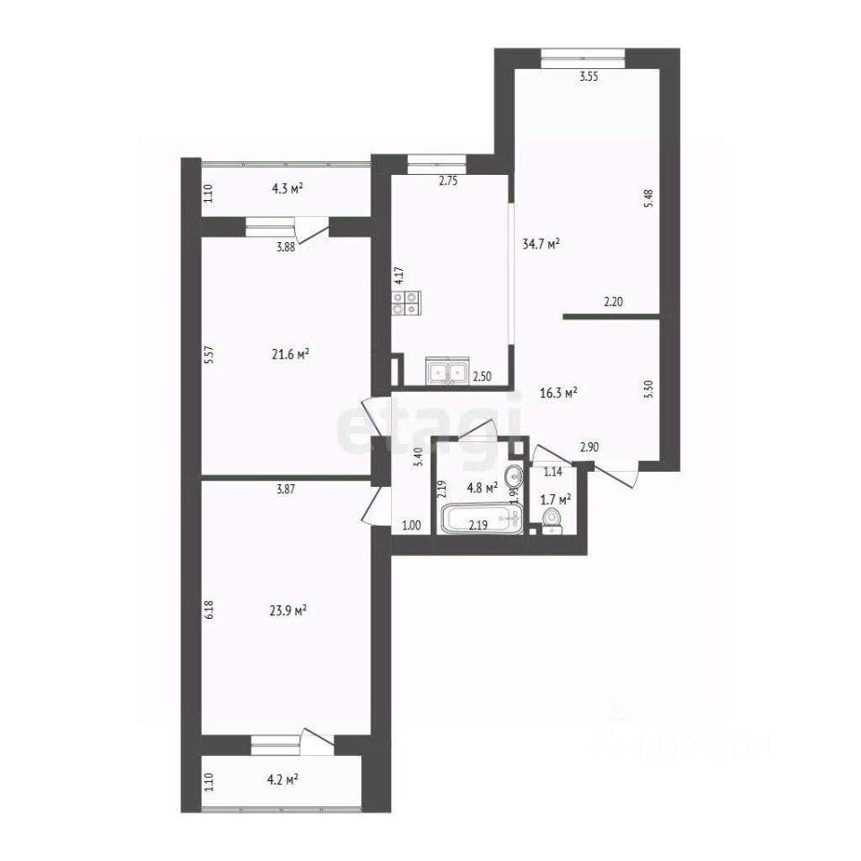 раздельный санузел: ванная 4.8 м2 и туалет 1.7 м2.