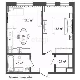 Удобная эргономичная планировка - общая площать более 44 кв.м., комнаты правильной формы, функционал включает в себя: кухню-стловую-гостиную почти 18 кв.м., спальню 16.6 кв.м., совмещенный сан.узел и гардеробную.
