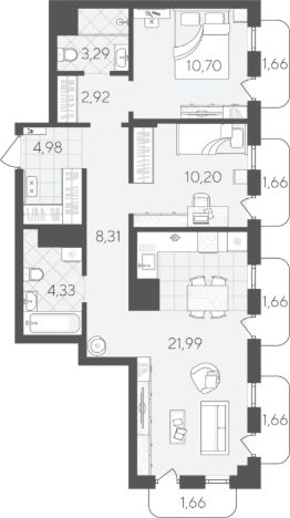 Квартира с двумя спальнями площадью 75.02 кв.м на 16 этаже с продуманной планировкой. Площадь квартиры условно разделена на гостевую зону и личное пространство только для вас и вашей семьи.