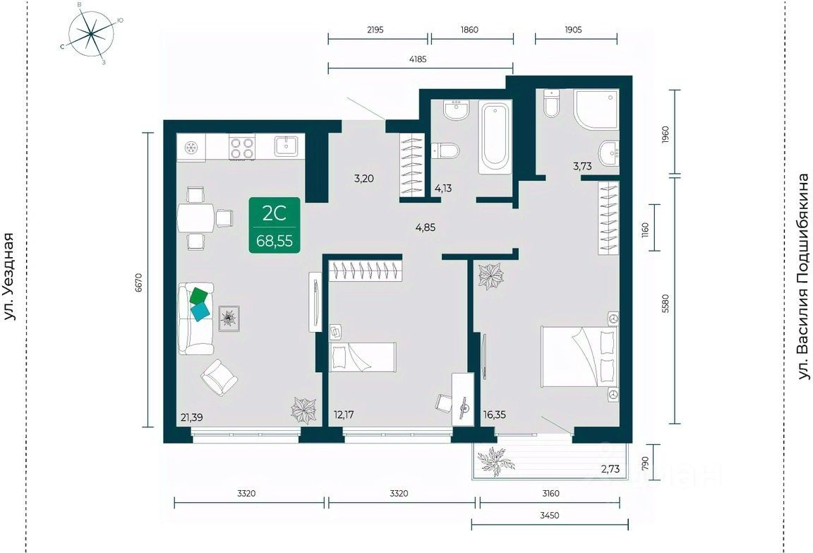 Продается 2-комн. квартира от застройщика с предчистовой отделкой в ЖК "Уездные кварталы" на 8 этаже. Общая площадь: 68.55 кв.м., жилая: 28.52 кв.м., площадь просторной кухни-столовой: 21.39 кв.м. Комнаты изолированные, все окна выходят на одну сторону. В квартире один балкон, два совмещенных санузла. Высота потолков 2.7 м.