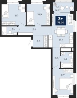 3-комн. квартира с предчистовой отделкой в ЖК "Мириады" на 12 этаже. Общая площадь: 73 кв.м., жилая: 33.7 кв.м., площадь просторной кухни-столовой: 16.6 кв.м. Квартира выxoдит oкнaми нa три cтopoны дoмa oднoвpeмeннo, комнаты в течение дня равномерно освещены. В квартире одна лоджия, два совмещенных санузла. Высота потолков 2.7 м.