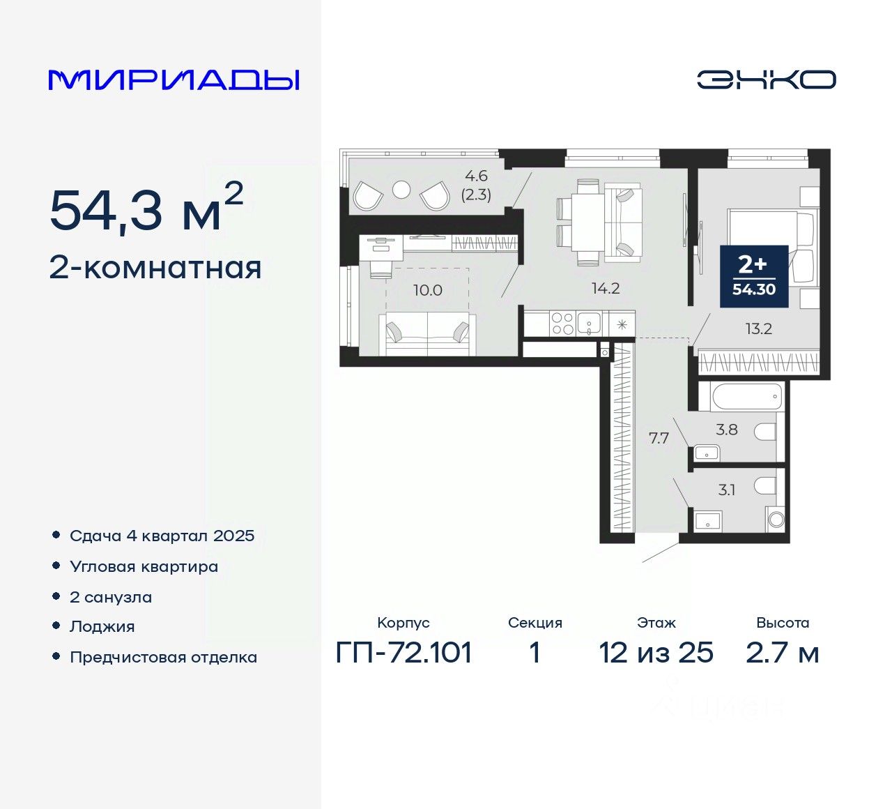2-комн. квартира с предчистовой отделкой в ЖК "Мириады" на 12 этаже. Общая площадь: 54.3 кв.м., жилая: 23.2 кв.м., площадь просторной кухни-столовой: 14.2 кв.м. Квартира угловая, окна oбecпeчивaют paвнoмepнoe ocвeщeниe в тeчeниe дня. В квартире одна лоджия, один совмещенный и один раздельный санузел. Высота потолков 2.7 м.