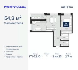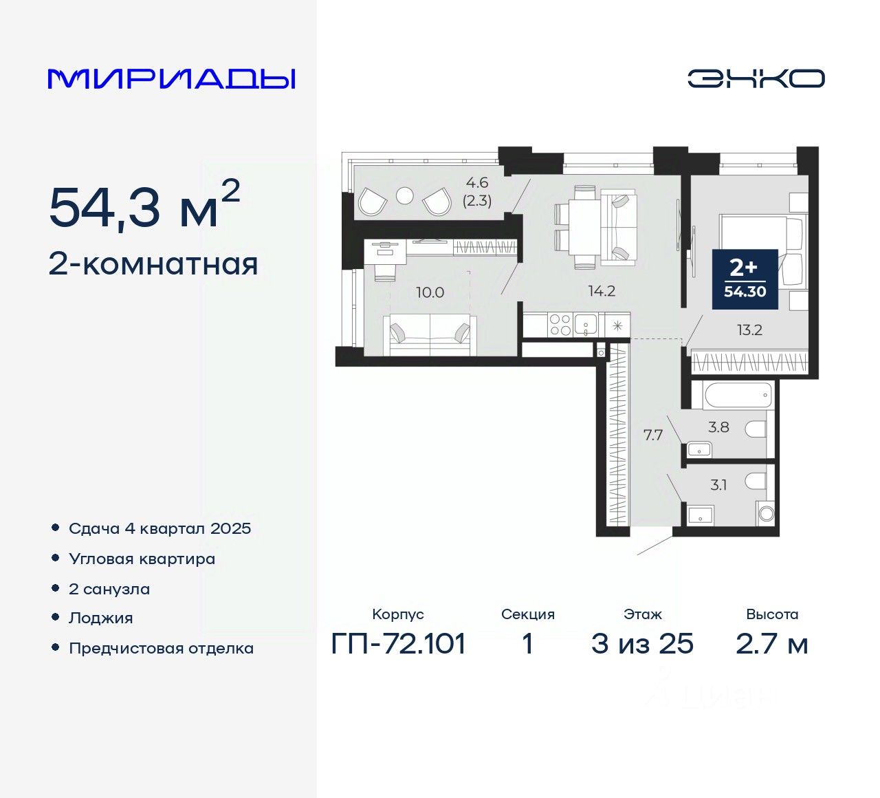 Продается двухкомнатная квартира с предчистовой отделкой в ЖК "Мириады" на 3 этаже. Общая площадь: 54.3 кв.м., жилая: 23.2 кв.м., площадь просторной кухни-столовой: 14.2 кв.м. Угловая квартира, очень светлая, естественная вентиляция при открытии окон. В квартире одна лоджия, один совмещенный и один раздельный санузел. Высота потолков 2.7 м.