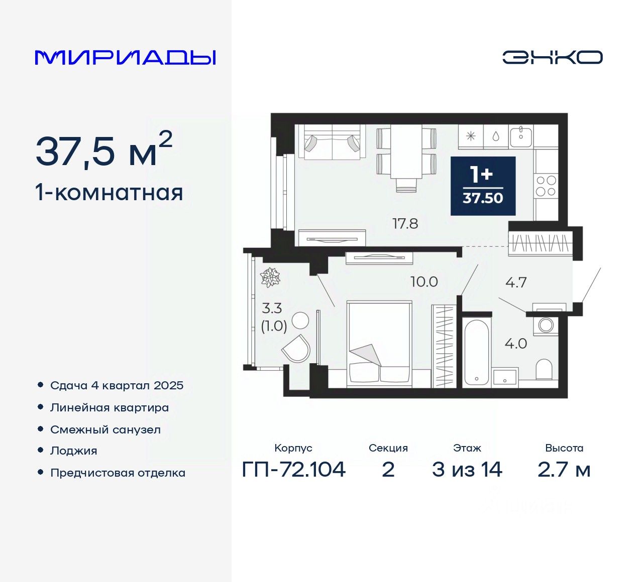 1-комн. квартира с предчистовой отделкой в ЖК "Мириады" на 3 этаже. Общая площадь: 37.5 кв.м., жилая: 10 кв.м., площадь просторной кухни-столовой: 17.8 кв.м. Все окна выходят на одну сторону. В квартире одна лоджия, один совмещенный санузел. Высота потолков 2.7 м.
