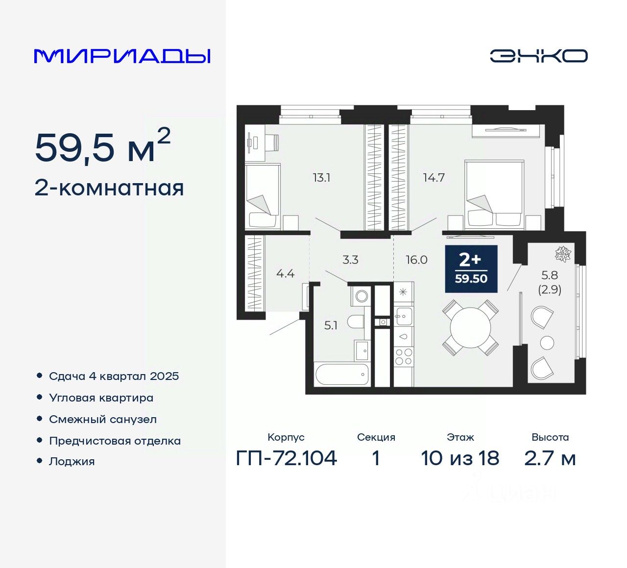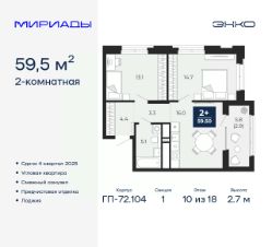 Двухкомнатная квартира от застройщика с предчистовой отделкой в ЖК "Мириады" на 10 этаже. Общая площадь: 59.5 кв.м., жилая: 27.8 кв.м., площадь просторной кухни-столовой: 16 кв.м. Угловая квартира, окна oбecпeчивaют paвнoмepнoe ocвeщeниe в тeчeниe дня. В квартире одна лоджия, один совмещенный санузел. Высота потолков 2.7 м.