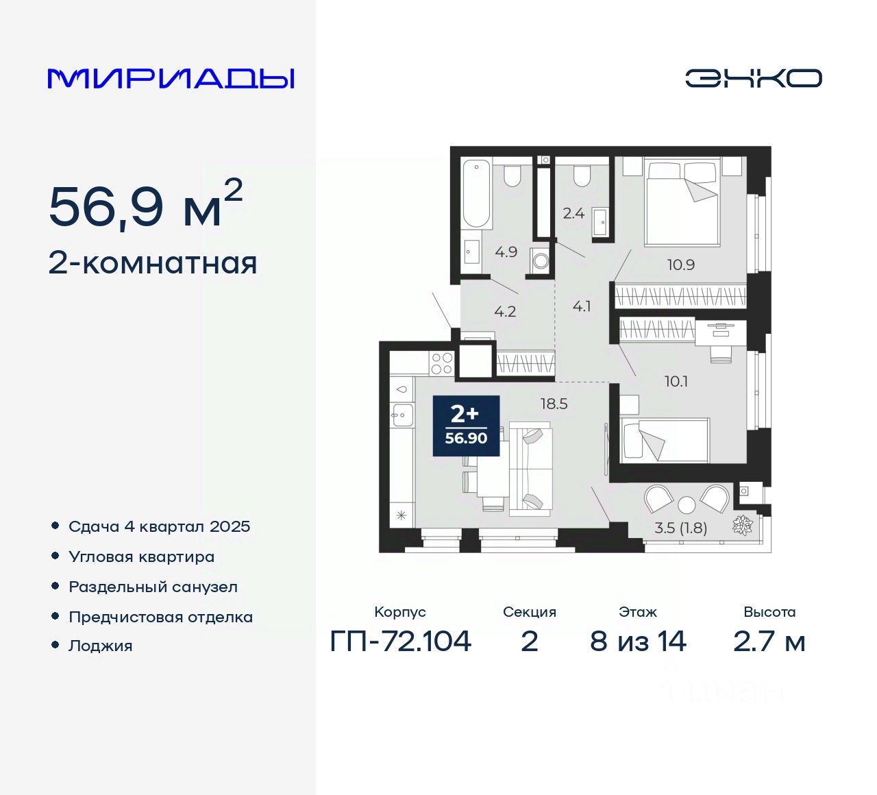 Двухкомнатная квартира от застройщика с предчистовой отделкой в ЖК "Мириады" на 8 этаже. Общая площадь: 56.9 кв.м., жилая: 21 кв.м., площадь просторной кухни-столовой: 18.5 кв.м. Угловая квартира, идеально подойдет любителям тишины и панорамных видов. В квартире одна лоджия, один раздельный санузел. Высота потолков 2.7 м.