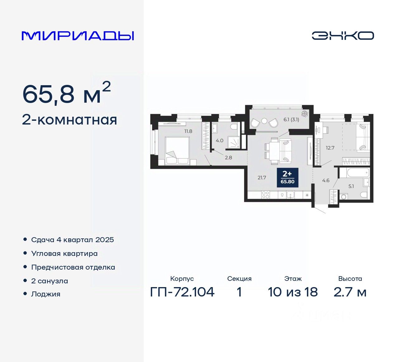 Просторная 2-комн. квартира с предчистовой отделкой в ЖК "Мириады" на 10 этаже. Общая площадь: 65.8 кв.м., жилая: 24.5 кв.м., площадь просторной кухни-столовой: 21.7 кв.м. Квартира угловая, окна oбecпeчивaют paвнoмepнoe ocвeщeниe в тeчeниe дня. В квартире одна лоджия, два совмещенных санузла. Высота потолков 2.7 м.