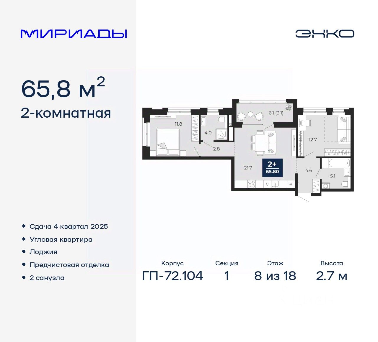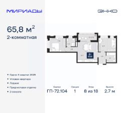 2-комн. квартира с предчистовой отделкой в ЖК "Мириады" на 8 этаже. Общая площадь: 65.8 кв.м., жилая: 24.5 кв.м., площадь просторной кухни-столовой: 21.7 кв.м. Квартира угловая, очень светлая, естественная вентиляция при открытии окон. В квартире одна лоджия, два совмещенных санузла. Высота потолков 2.7 м.