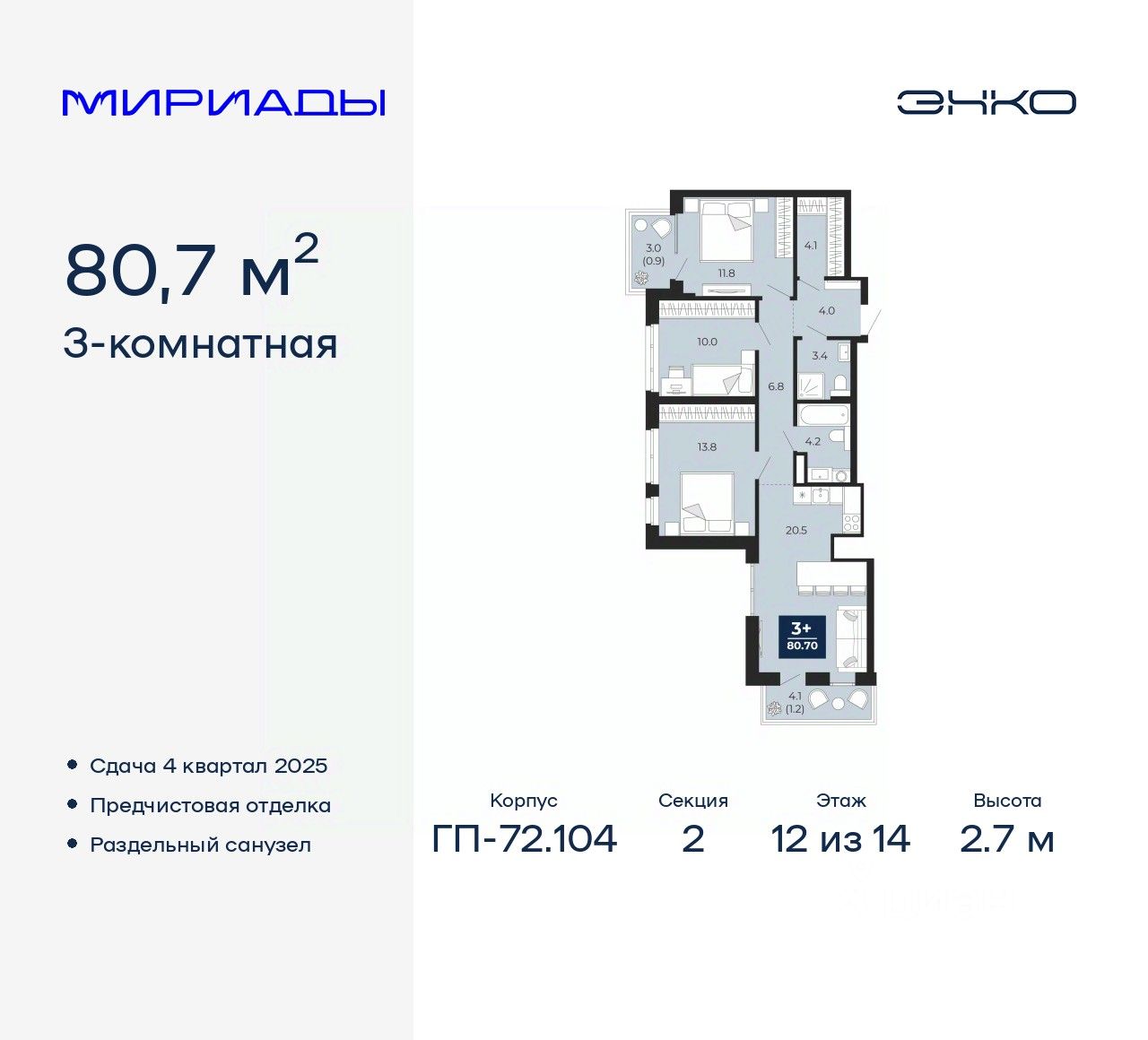 Трехкомнатная квартира от застройщика с предчистовой отделкой в ЖК "Мириады" на 12 этаже. Общая площадь: 80.7 кв.м., жилая: 35.6 кв.м., площадь просторной кухни-столовой: 20.5 кв.м. Квартира угловая, окна oбecпeчивaют paвнoмepнoe ocвeщeниe в тeчeниe дня. В квартире два балкона, два совмещенных санузла. Высота потолков 2.7 м.