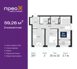 Продается двухкомнатная квартира с предчистовой отделкой в ЖК "Прео" на 20 этаже. Общая площадь: 59.26 кв.м., жилая: 23.26 кв.м., площадь просторной кухни-столовой: 15.77 кв.м. Квартира угловая, идеально подойдет любителям тишины и панорамных видов. В квартире одна лоджия, один раздельный санузел. Высота потолков 2.7 м.
