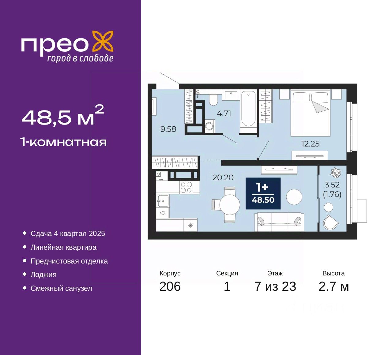 Просторная 1-комн. квартира с предчистовой отделкой в ЖК "Прео" на 7 этаже. Общая площадь: 48.5 кв.м., жилая: 12.25 кв.м., площадь просторной кухни-столовой: 20.2 кв.м. Все окна выходят на одну сторону. В квартире одна лоджия, один совмещенный санузел. Высота потолков 2.7 м.