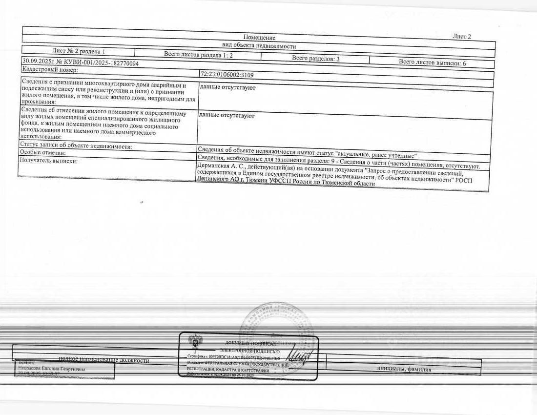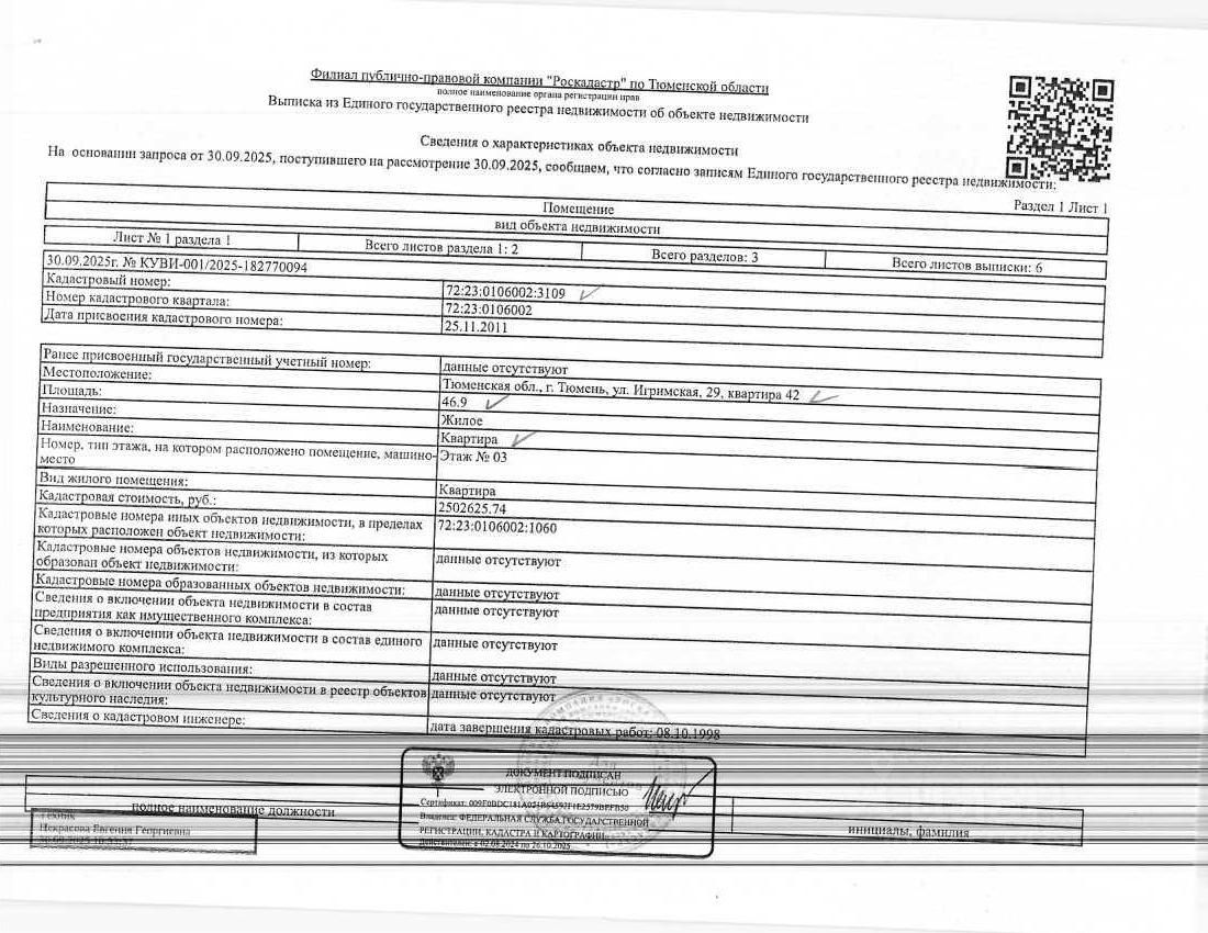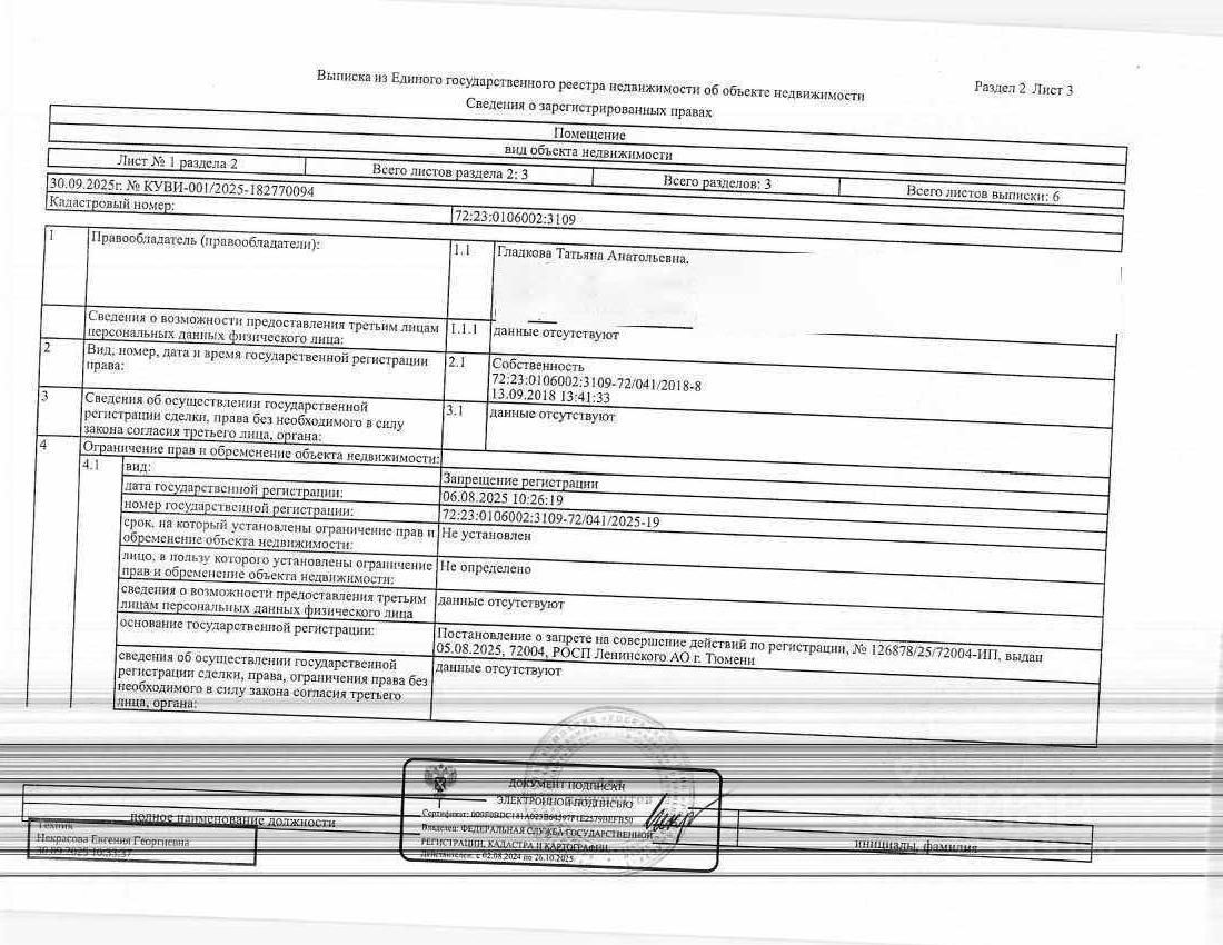 Должник: Гладкова Т.А., собственник: Гладкова Т.А. Лот: Жилое помещение (квартира), площадь 46,9 кв.м., кадастровый номер; 72:23:0106002:3109, г. Тюмень, ул. Игримская, д. 29, кв. 42, (зарегистрировано 3 взрослых, 2 несовершеннолетних, задолженность по капитальному ремонту отсутствует), н/ц: 3102641,60 р., з-к: 3102 р, код: 0014, рег. 72-010409;