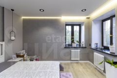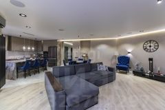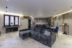 Потолки по всей квартире - парящие многоуровневые с возможностью выбора уровня и зон освещенности. Светильники дизайнерские, заказывались из Италии, в зоне гостинной предусмотрены напольные розетки. Продумано всё до мелочей для ваших семейных вечеров.