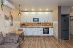 Современный кухонный гарнитур оснащен встроенной бытовой техникой - индукционная ТРех-конфорочная плита, духовой шкаф, вытяжка. Для холодильника организована специальная ниша - очень удачное решение