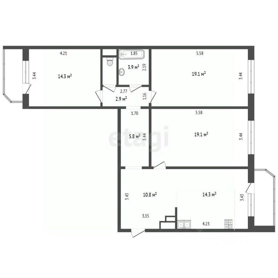 Отличная квартира-распашонка (окна выходят на обе стороны дома) для большой семьи. Три изолированные комнаты (19,2; 14,5; 19,2 кв.м), просторная кухня-гостиная (25 кв.м), раздельный санузел, два балкона.
