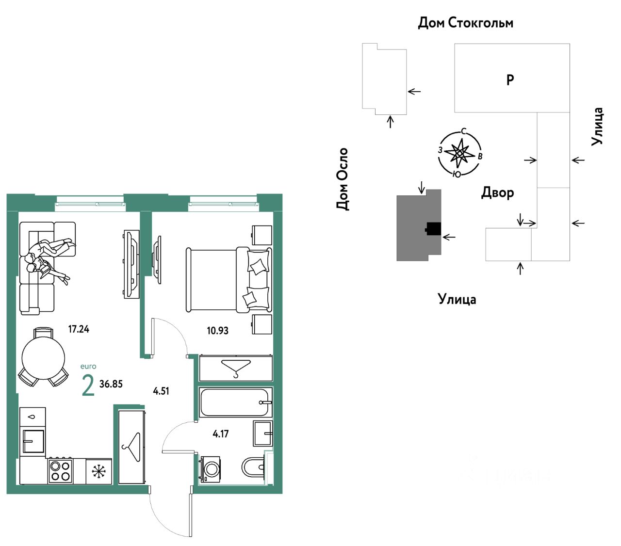 Продается 2комнатная квартира на 7 этаже от застройщика Страна Девелопмент. Площадь квартиры 36,85 кв. м.