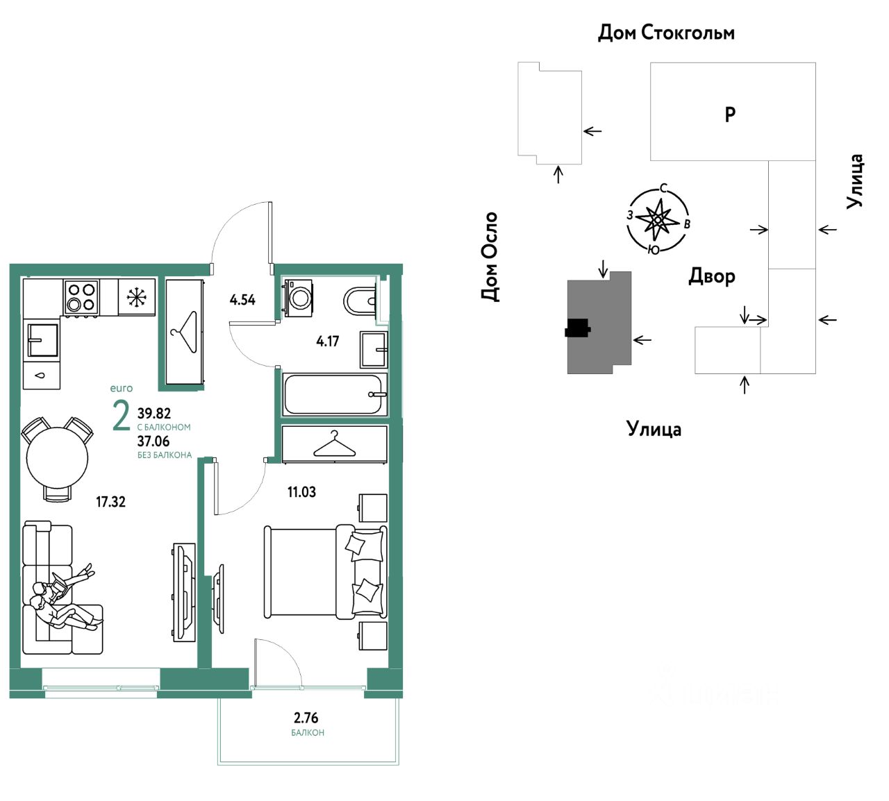 Продается 2комнатная квартира на 9 этаже от застройщика Страна Девелопмент. Площадь квартиры 39,82 кв. м.