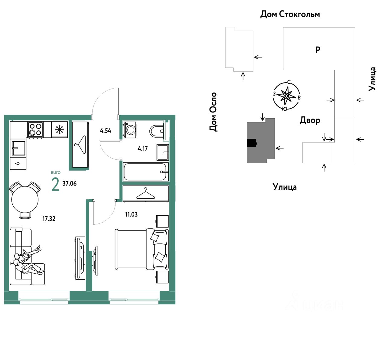 Продается 2комнатная квартира на 13 этаже от застройщика Страна Девелопмент. Площадь квартиры 37,06 кв. м.