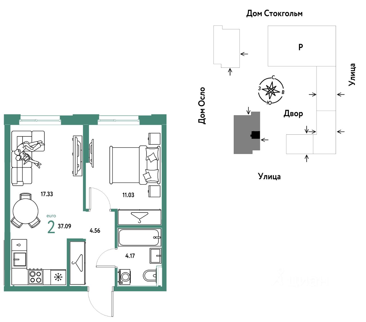 Продается 2комнатная квартира на 14 этаже от застройщика Страна Девелопмент. Площадь квартиры 37,09 кв. м.