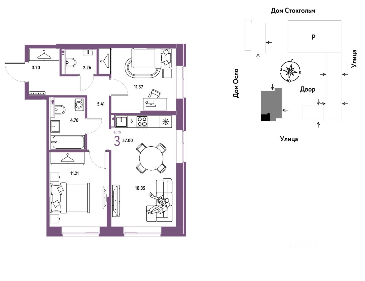 Продается 3комнатная квартира на 24 этаже от застройщика Страна Девелопмент. Площадь квартиры 57 кв. м.
