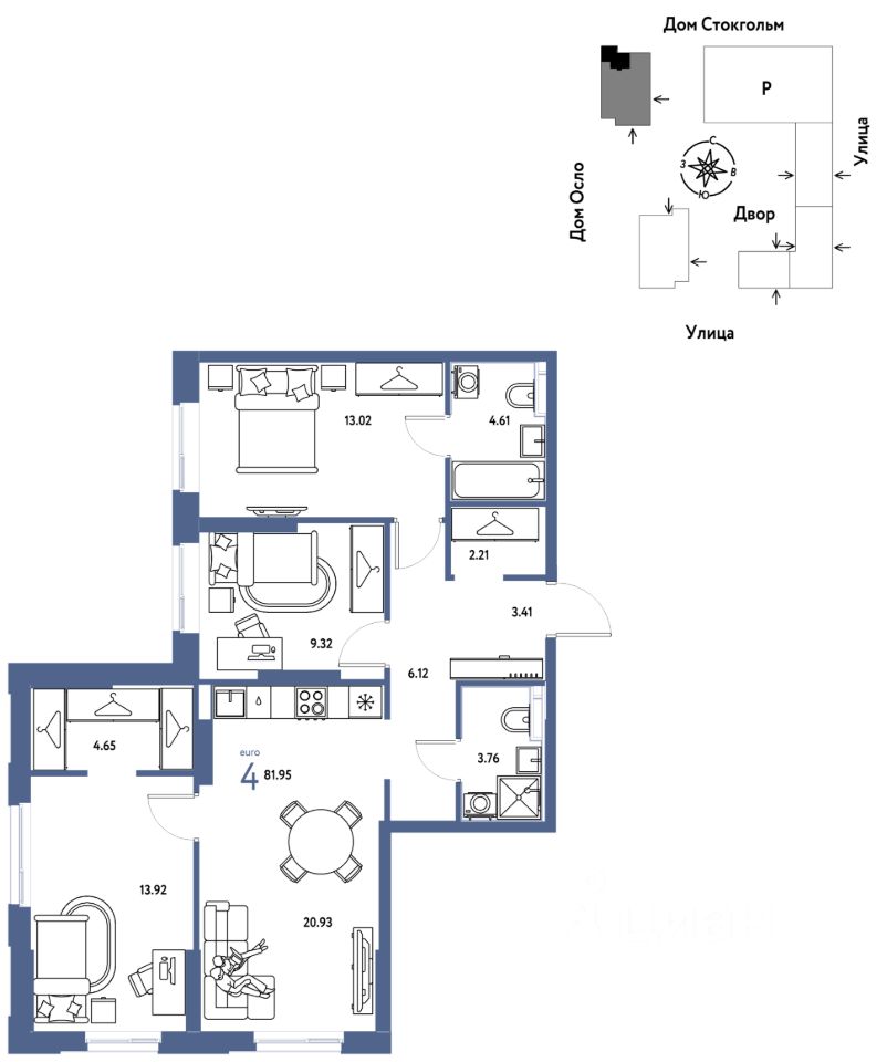 Продается 4комнатная квартира на 4 этаже от застройщика Страна Девелопмент. Площадь квартиры 81,95 кв. м.