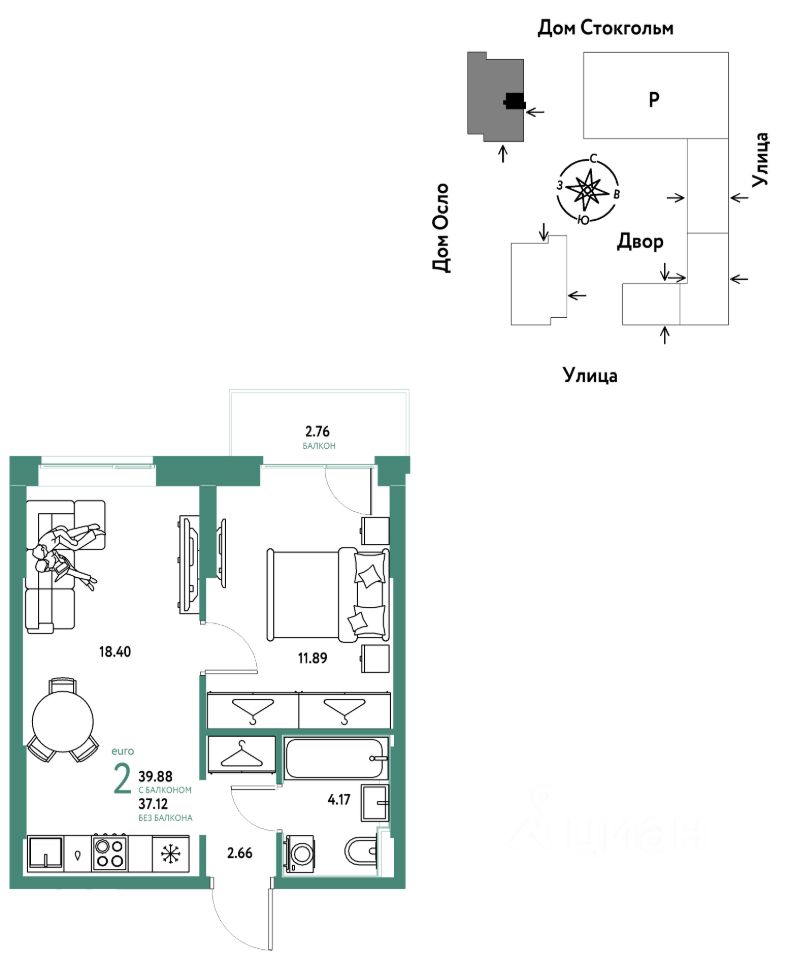 Продается 2комнатная квартира на 5 этаже от застройщика Страна Девелопмент. Площадь квартиры 39,88 кв. м.