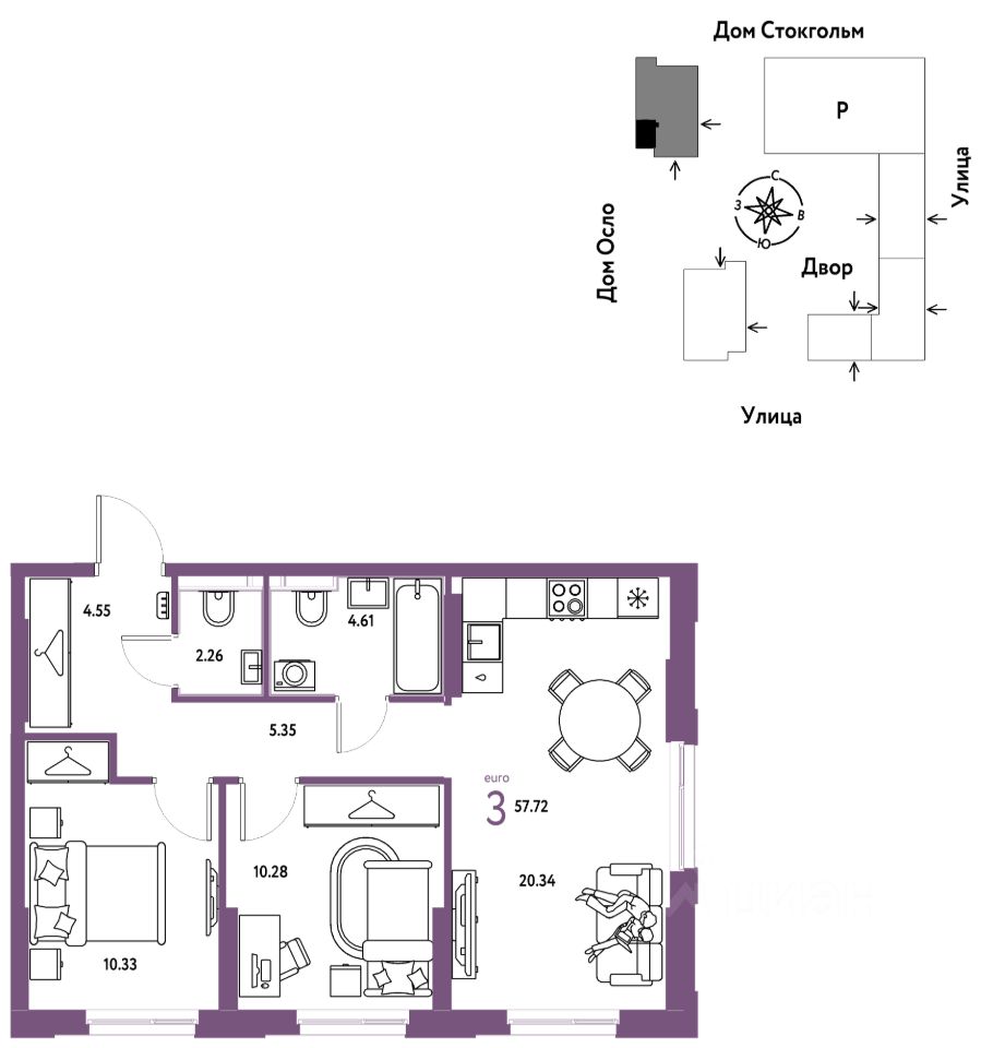 Продается 3комнатная квартира на 7 этаже от застройщика Страна Девелопмент. Площадь квартиры 57,72 кв. м.