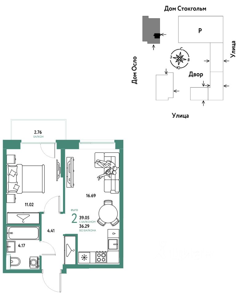 Продается 2комнатная квартира на 11 этаже от застройщика Страна Девелопмент. Площадь квартиры 39,05 кв. м.