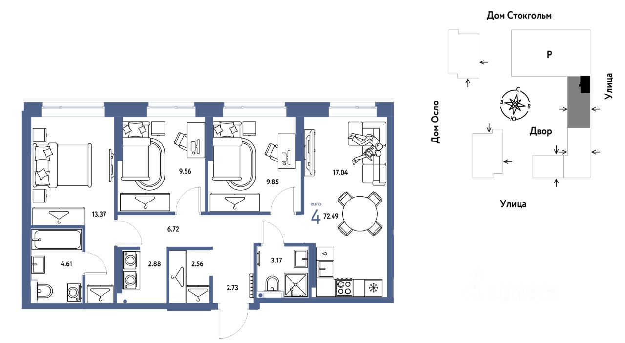 Продается 4комнатная квартира на 2 этаже от застройщика Страна Девелопмент. Площадь квартиры 72,49 кв. м.