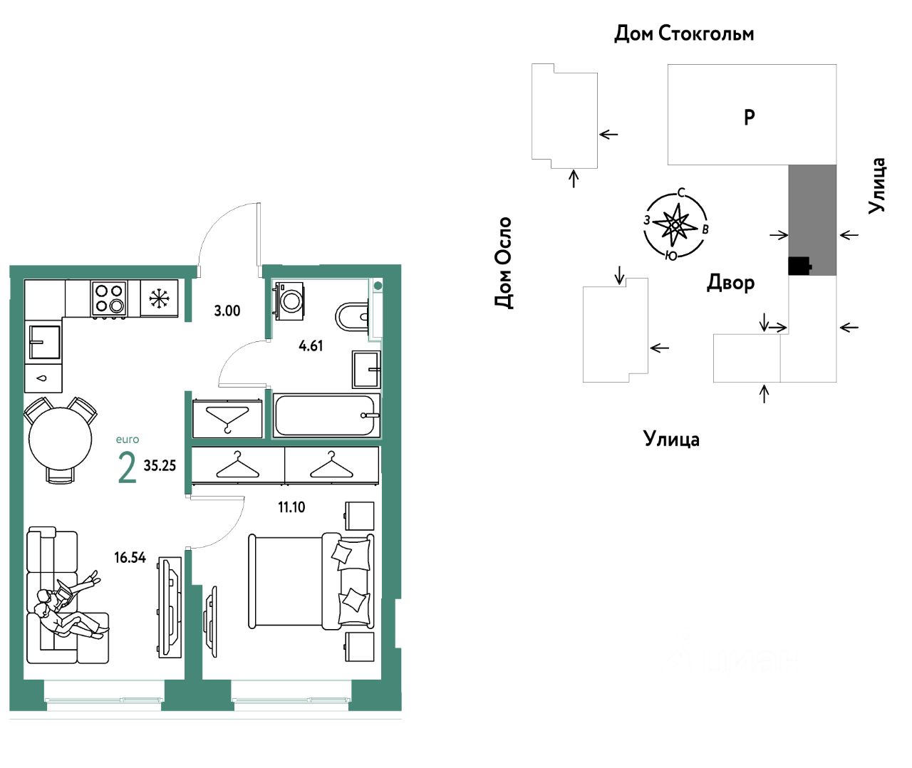Продается 2комнатная квартира на 2 этаже от застройщика Страна Девелопмент. Площадь квартиры 35,25 кв. м.