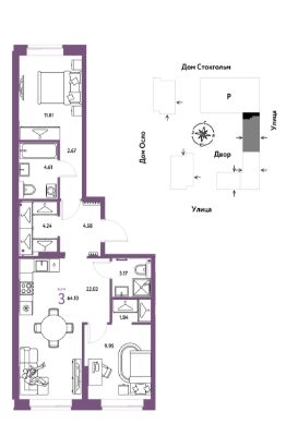 Продается 3комнатная квартира на 5 этаже от застройщика Страна Девелопмент. Площадь квартиры 64,1 кв. м.