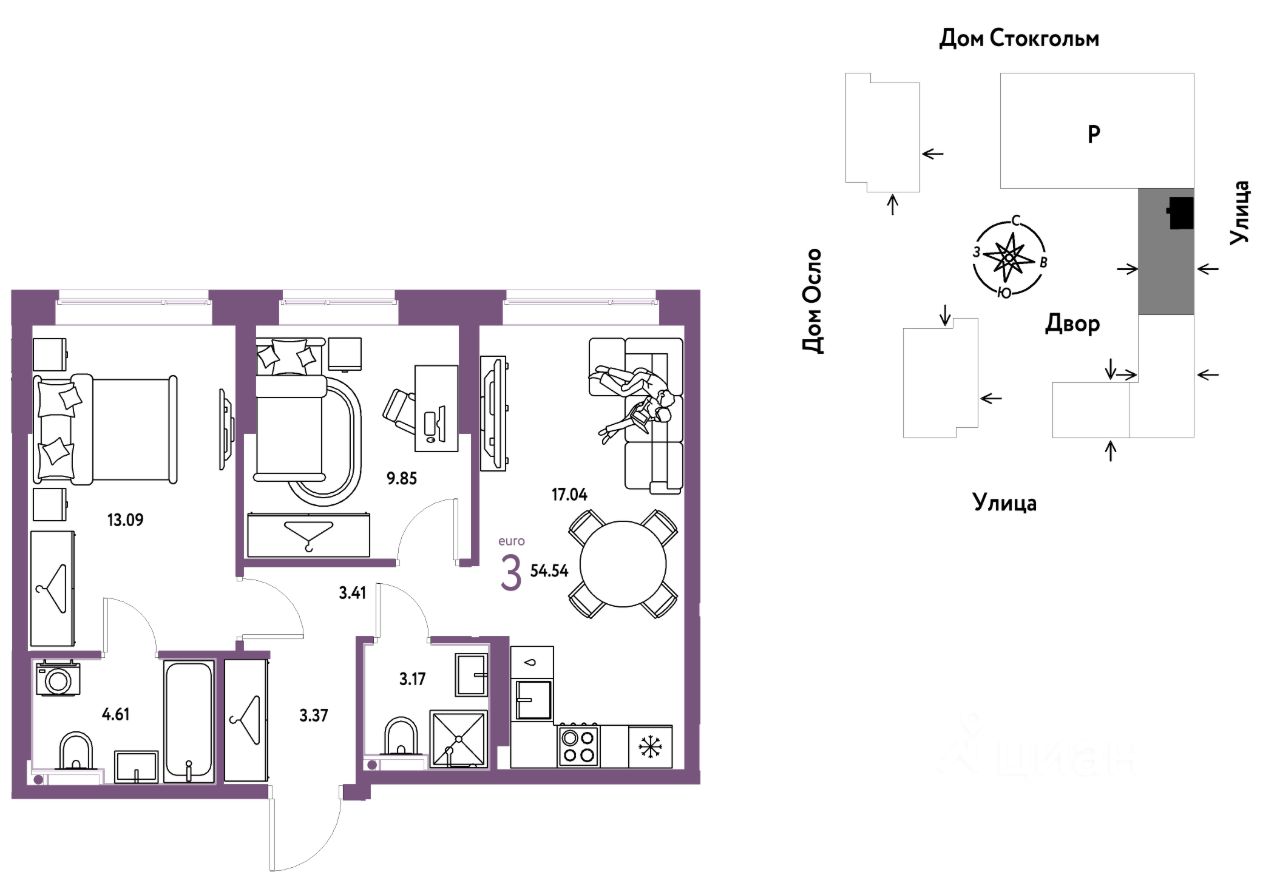 Продается 3комнатная квартира на 5 этаже от застройщика Страна Девелопмент. Площадь квартиры 54,54 кв. м.