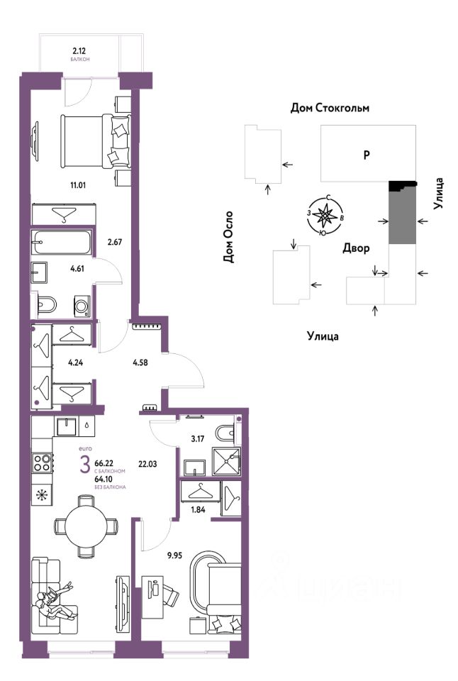 Продается 3комнатная квартира на 6 этаже от застройщика Страна Девелопмент. Площадь квартиры 66,22 кв. м.