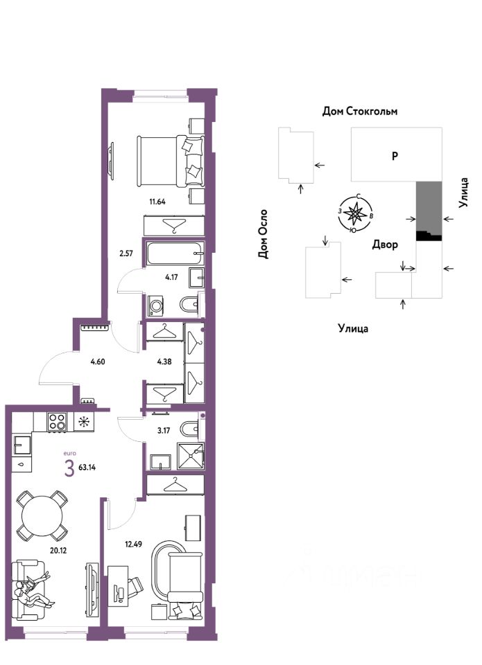 Продается 3комнатная квартира на 10 этаже от застройщика Страна Девелопмент. Площадь квартиры 63,14 кв. м.