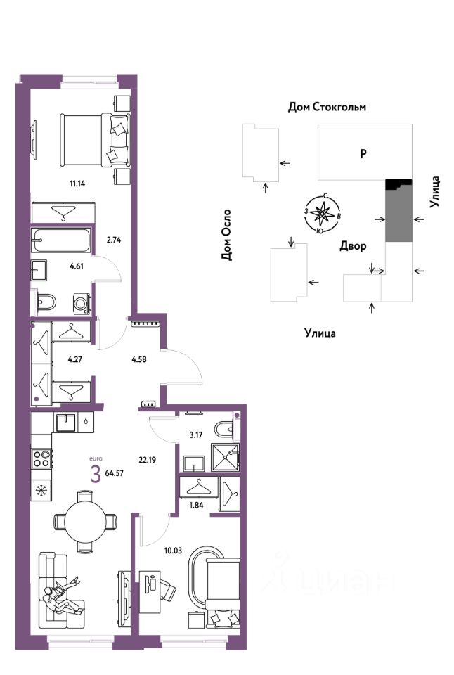 Продается 3комнатная квартира на 13 этаже от застройщика Страна Девелопмент. Площадь квартиры 64,57 кв. м.