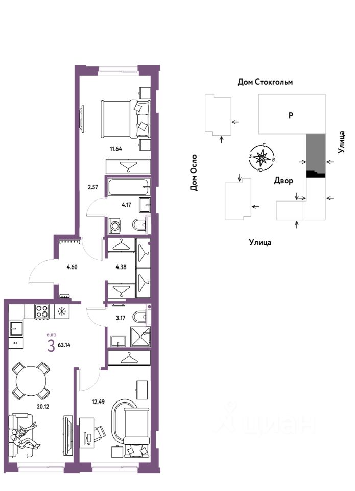 Продается 3комнатная квартира на 14 этаже от застройщика Страна Девелопмент. Площадь квартиры 63,14 кв. м.