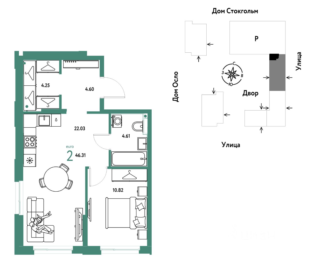 Продается 2комнатная квартира на 23 этаже от застройщика Страна Девелопмент. Площадь квартиры 46,31 кв. м.