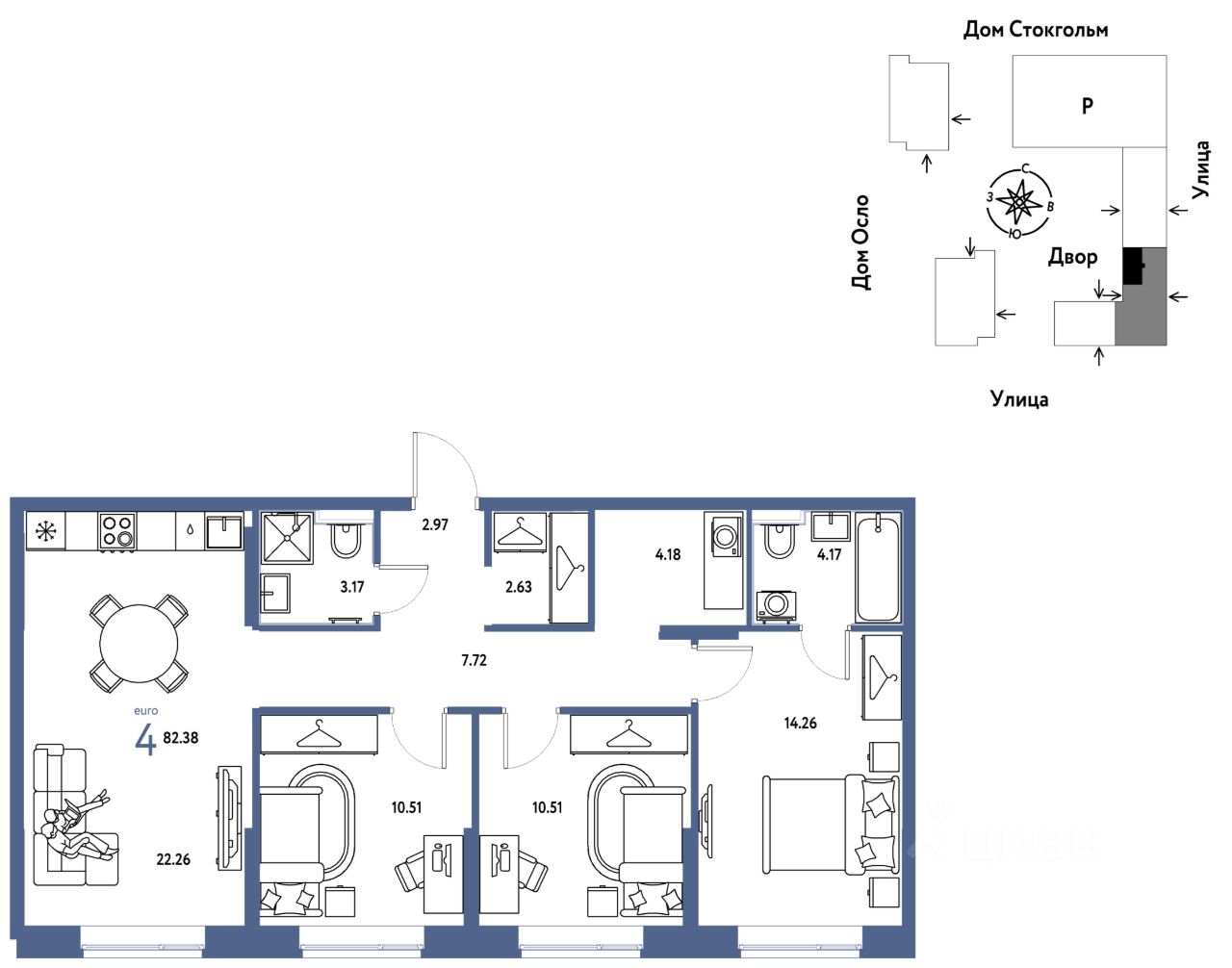 Продается 4комнатная квартира на 4 этаже от застройщика Страна Девелопмент. Площадь квартиры 82,38 кв. м.