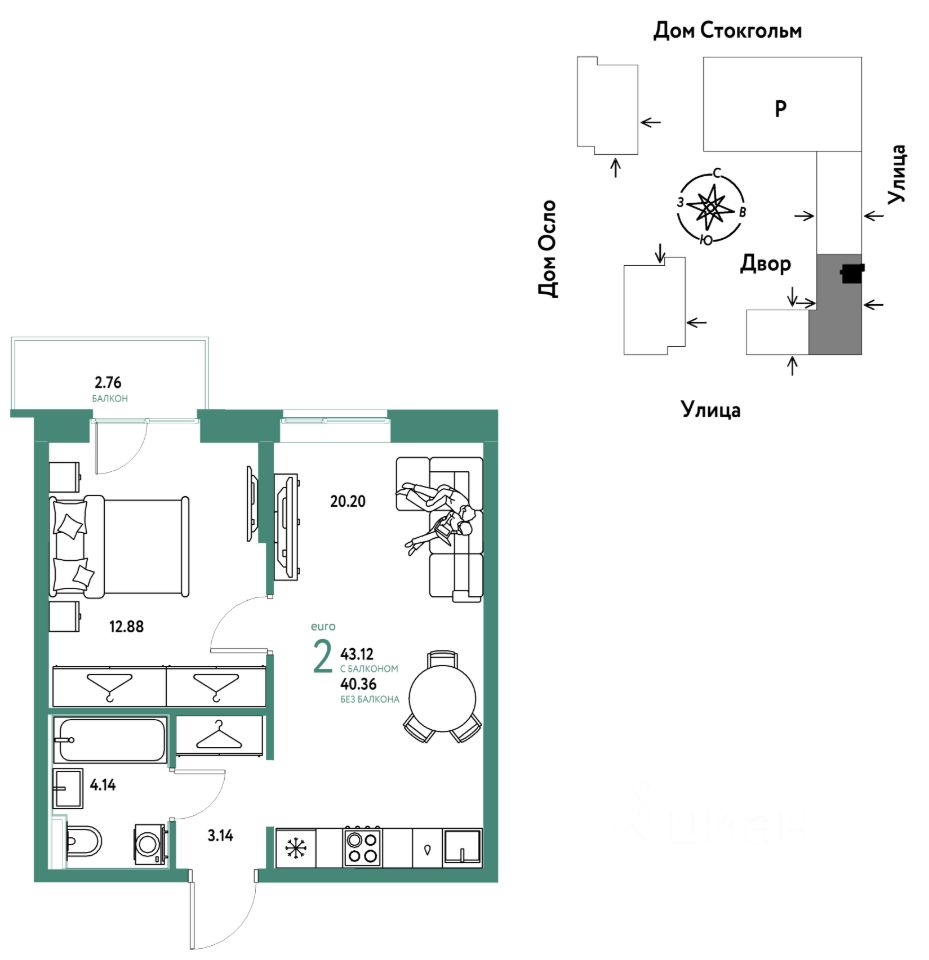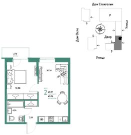 Продается 2комнатная квартира на 4 этаже от застройщика Страна Девелопмент. Площадь квартиры 43,12 кв. м.
