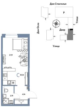 Продается 1комнатная квартира на 5 этаже от застройщика Страна Девелопмент. Площадь квартиры 30,24 кв. м.