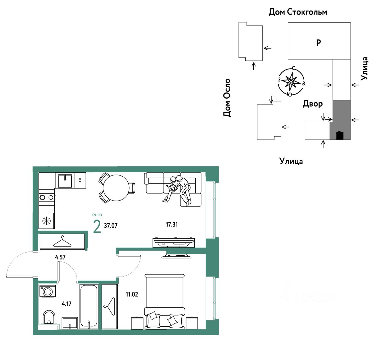 Продается 2комнатная квартира на 5 этаже от застройщика Страна Девелопмент. Площадь квартиры 37,07 кв. м.