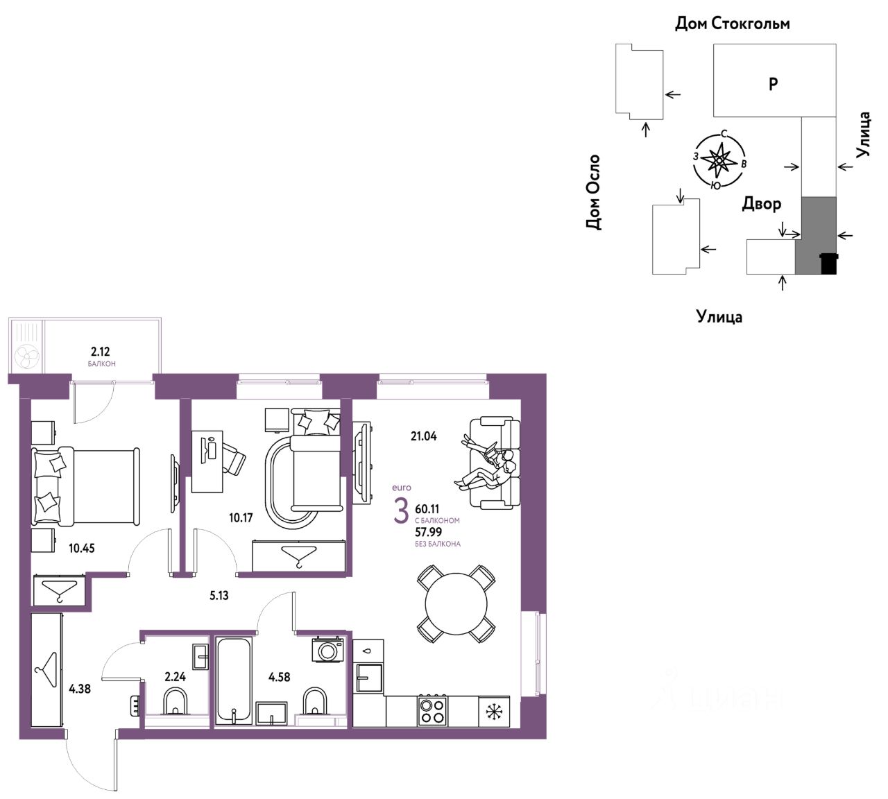 Продается 3комнатная квартира на 6 этаже от застройщика Страна Девелопмент. Площадь квартиры 60,11 кв. м.
