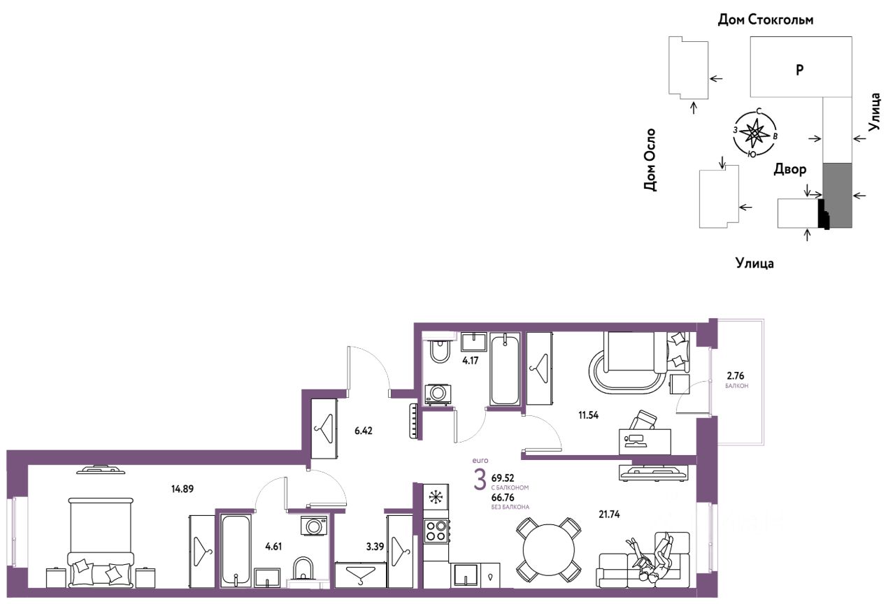 Продается 3комнатная квартира на 6 этаже от застройщика Страна Девелопмент. Площадь квартиры 69,52 кв. м.