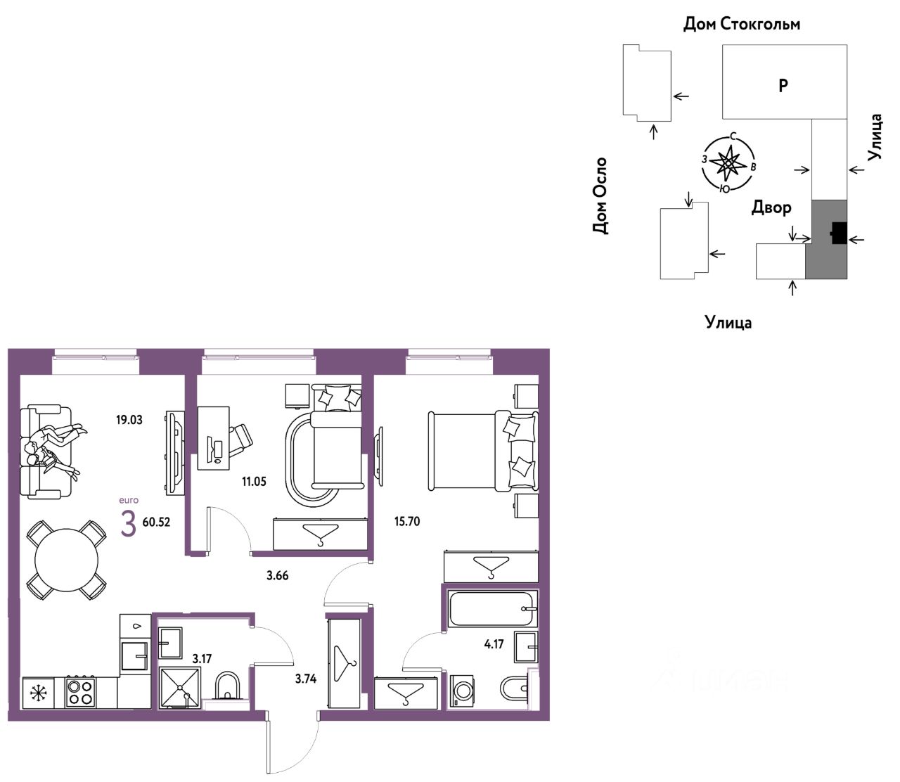 Продается 3комнатная квартира на 8 этаже от застройщика Страна Девелопмент. Площадь квартиры 60,52 кв. м.